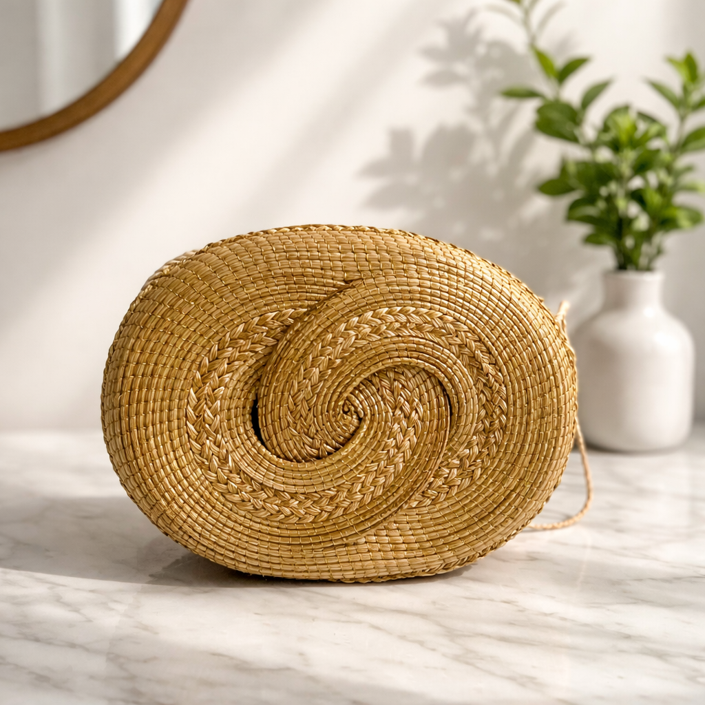 El tejido en espiral concentra la mirada en su núcleo, donde la luz se intensifica y revela la riqueza del capim dourado trabajado a mano.