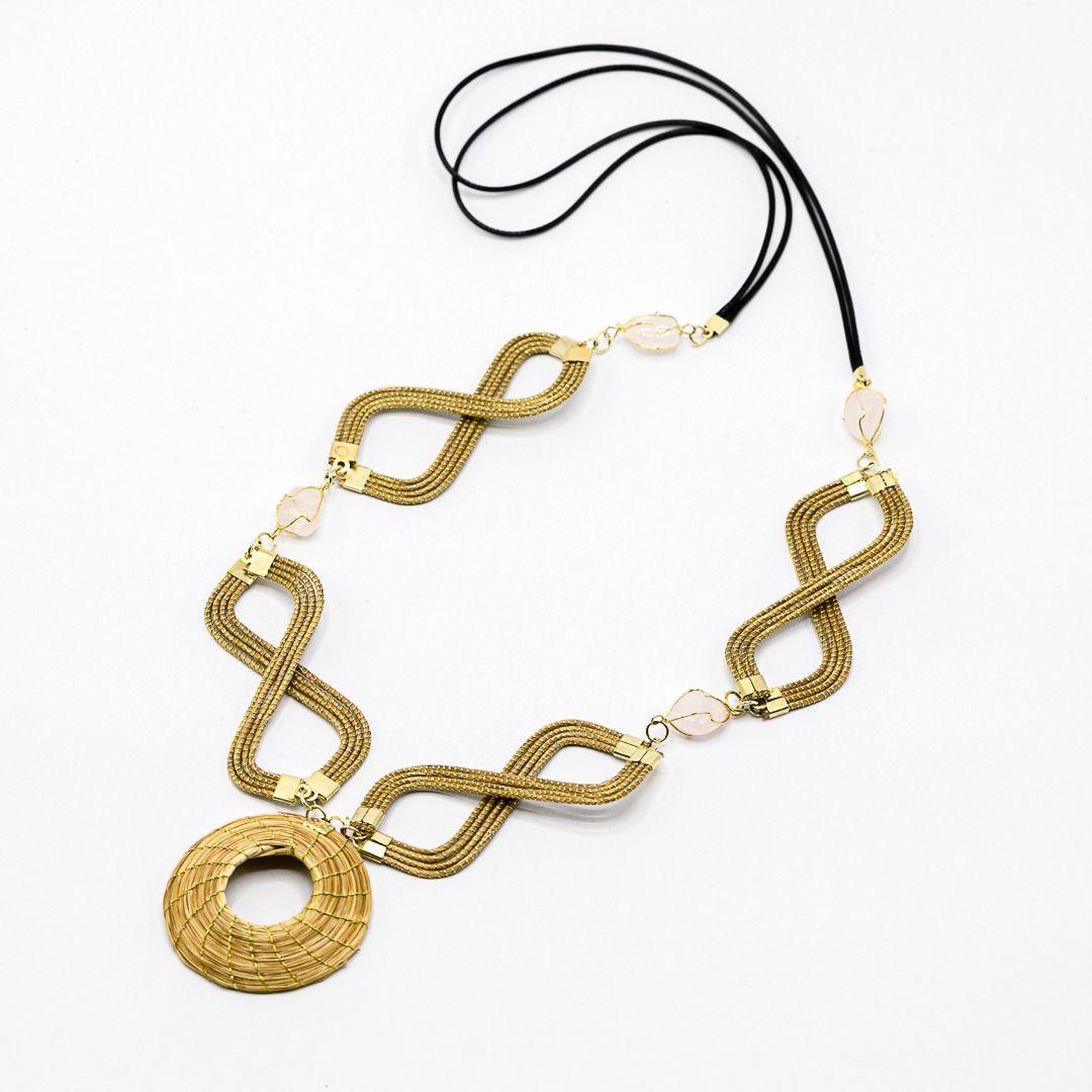 Collar largo con detalles en cestería con piedra de quartzo rosa